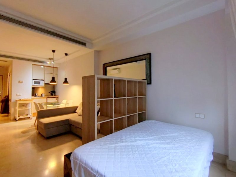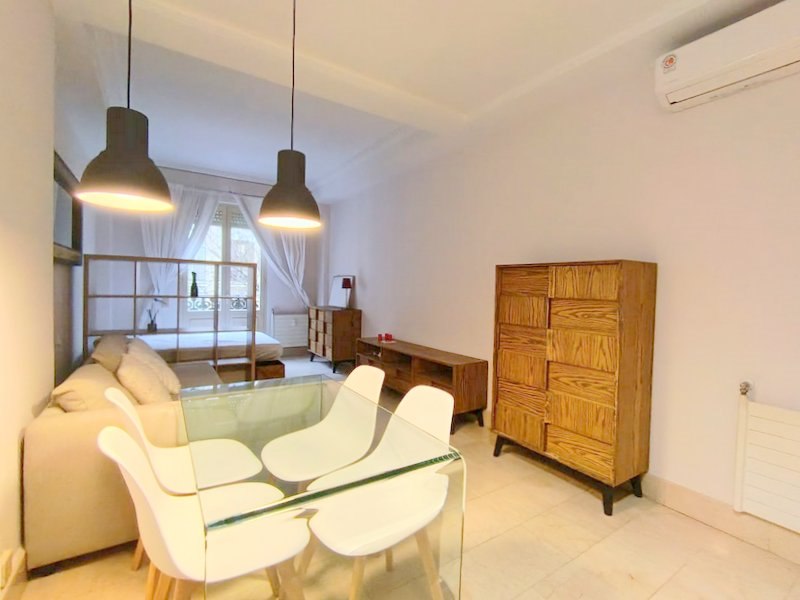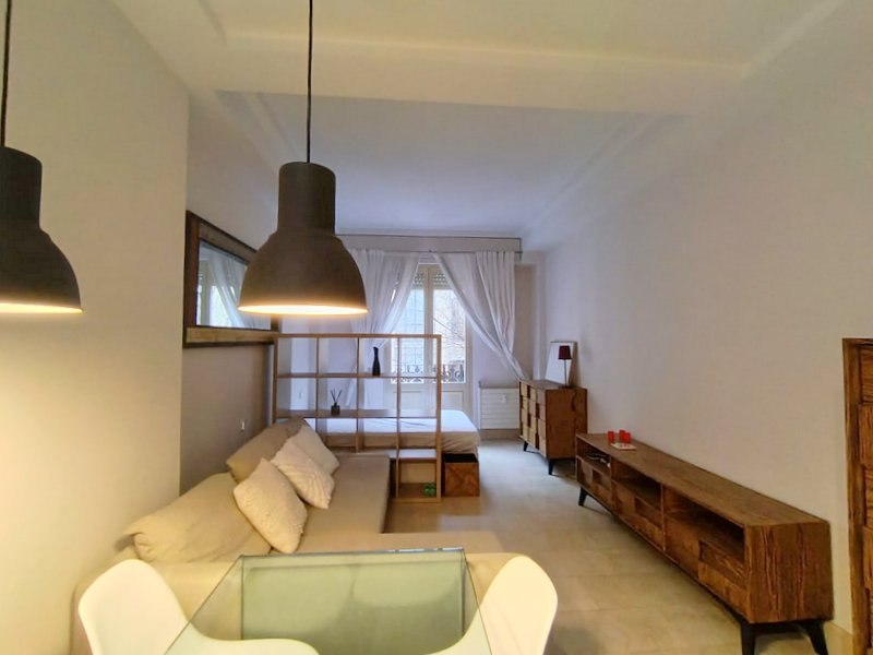 Estamos ante un estudio en buen estado, exterior, con un mini balcón a la calle. Cuenta con una pequeña cocina americana equipada, baño completo con bañera y salón con un gran sofá/cama Cheslong, y mesa comedor para 4 comensales. Luego una bonita estantería separa la zona de descanso, con cama de matrimonio y cómodo y aprovechable canapé. Ventana climalit desde el suelo al techo que da paso al pequeño balcón exterior. Calefacción individual y A.A mediante splite